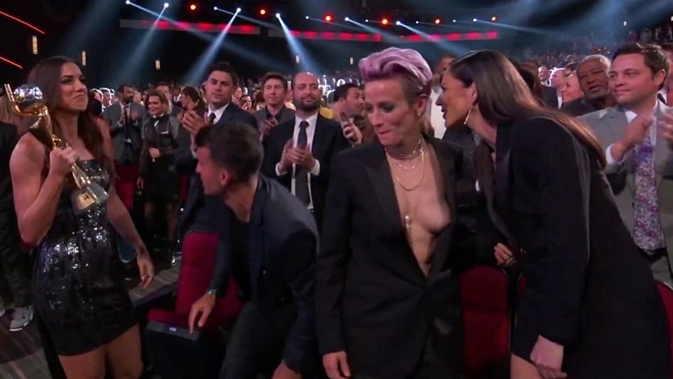 Megan Rapinoe had a spectacular 2019 when she led the US Women's National Soccer Team to World Cup glory last summer! Her outspoken attitude and no-holds-barred way of living earned her a ton of respect and new fans, and she capped it off by going shirtless under a blazer at the ESPY Awards. When she and her teammates won an award, her blazer opened up as she kissed her partner Sue Bird, giving us a nip slip to remember for years to come!
