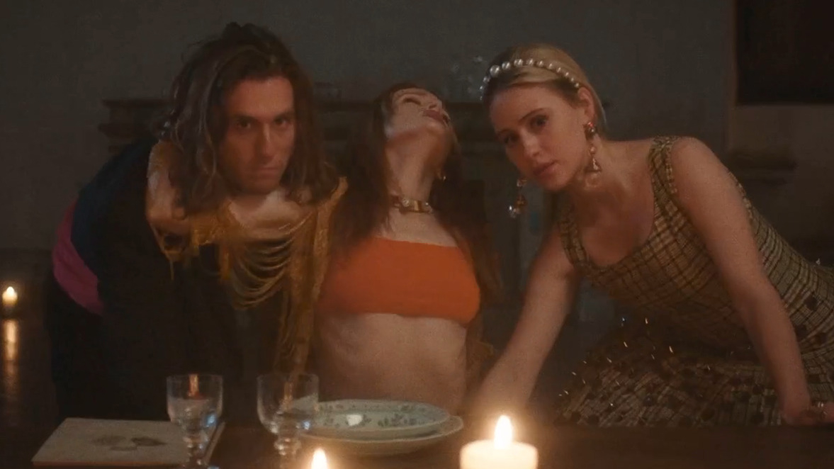 Journalist Dylan (Daryl Wein) arrives in Rome with his photographer girlfriend Lucy (Abigail Cown) to interview faded rock star Milo (Jack Farthing). After initially hitting it off, the couple gets invited to Milo’s palazzo where he lives with Francesca (Maria Bakalova), a performance artist with whom he’s in an open relationship. At first it seems like Dylan and Lucy are completely taken in by Milo and Francesca’s carefree lifestyle and rejection of societal expectations, until the situation is turned on its head with the reveal that Dylan and Lucy are there under false pretenses. This causes Francesca to confront Lucy while dancing, and that fight turns into a full on lesbian make out sesh! There’s another moment that’s not what it seems when Maria seems to finger Abigail below the table, while Dary watches, and like him, the reaction in your pants will be Electra-fying!