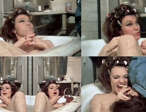Jeramie Dreyfuss has declared that she hopes her kids won't see a wink of certain footage from her flash-in-the-pan acting career. Well, that won't last. Under the name Jeramie Rain, the former Mrs. Richard Dreyfuss electrified exploitation screen as a bisexual in Wes Craven's horror landmark Last House on the Left (Picture: 1) and opposite Cheri Caffaro in Don Schain's New Jersey masterpiece-of-ass The Abductors (Picture: 1 - 2 - 3 - 4). With appearances in cult sensations such as those, it'll be tough for Jeramie to keep her body (of work) permanently under wraps.