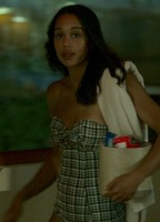 Chicago-born model/actress Laura Harrier took the Big Apple by storm with her exotic good looks, megawatt smile, and big personality. After moving to New York, Laura worked the runway and graced the pages of various magazines before appearing on TV. Her early credits include the soap opera One Life to Live and the CBS crime drama Unforgettable. She then made the switch to movies like Galyntine (2014), 4th Man Out (2015), and the short film The Realest Real (2016). Although her career was already on the rise, it was her nearly-nude appearance in The Last Five Years (2014) that had us throbbing with anticipation. Laura doesn’t get naked in the film, but she does crawl into bed with her man wearing just her bra and panties. With a nice dose of cleavage and some serious cheekage, she looks so hot that you will spend the next five years pounding it to her perfect body! She made her skimpy debut on the big, big, BIG screen in 2017's Spiderman: Homecoming when she donned a teeny bikini by the pool, giving us a splash-worthy show. That'll have you shooting white webs! After continuing to distinguish herself as a first-rate actor, first in the Spike Lee biographical film BlacKkKlansman (2018) and later in the indie drama Balance, Not Symmetry (2019), Laura went back to her near-nude roots by stripping to her undies and performing a lap dance in the Netflix miniseries Hollywood. We don't know who this Holly is, but Mr. Skin has wood.