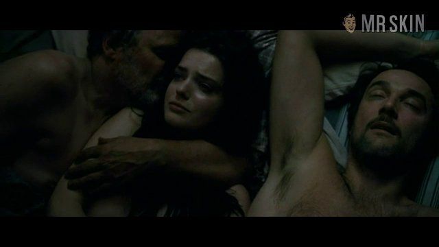 Roxane Mesquida plays a murderous mute in the revenge thriller Sennentuntschi (2010). High in the Swiss Alps, Sennentuntschi are straw dolls created by lonely shepherds to fill in for female flesh. According to legend, sometimes they come to life and seek bloody revenge for all the abuse heaped on them by the horny goatherds. In the movie version of this freaky folk tale, mute, wild-eyed Roxane suddenly appears in a mountain village right before shepherds start mysteriously disappearing. Real-life murder mysteries are woven in with morbid mythology in this twisted tale of revenge. Roxane flashes some seat meat in an upskirt shot when she's chased by one of the shepherds, but her breast nudity is her moth-watering meat loaves in the middle of a hairy man sandwich. In the shepherds' cabin, topless Roxane's on top of one drunk dude while another mounts her from behind as she fights and scratches. After the men go to sleep, we get another look at Roxane’s rack lying between them before she slips out of bed with murder on her mind. All that's missing is the senencuntschi.