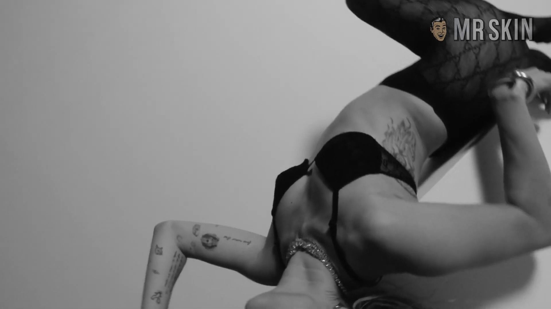 SHE IS COMING - D.R.E.A.M. sequence is a black-and-white music video to promote Miley Cyrus' album She Is Coming. She is coming and so will you when you see her see-through black bra that shows off her bouncy nips. She poses and dances in stockings, black underwear, and this nipply bra that has us dreaming of more to come.