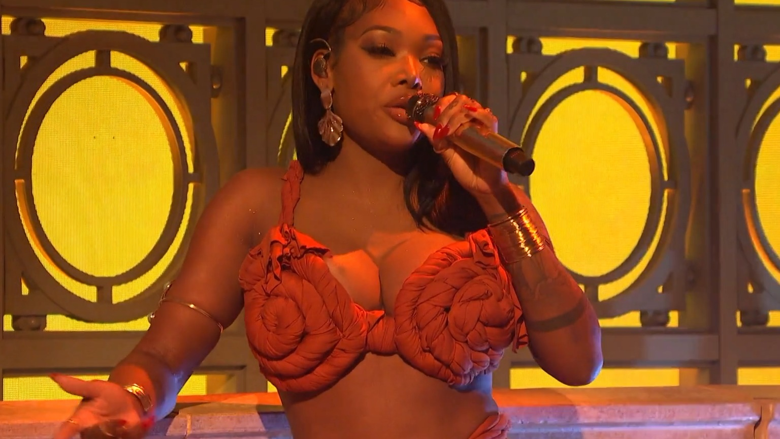 Summer no doubt put the hot in her hometown of Hot-lanta while working as a stripper when she wasn’t running her cleaning business, but ever since she gained fame for her covers and music videos on YouTube, her hotness is now a widespread phenomenon! After breaking into the industry via social media, Summer signed with the record label Love Rennaissance in 2017 and released her debut mixtape Last Day of Summer the following year. Her 2019 debut studio album Over It was one even bigger success, peaking at number two on the Billboard 200 chart and briefly breaking the record for the biggest debut streaming week for a female R&B artist, so it’s no surprise that her second album Still Over It (2021) broke the record for most streams in a single day by a female artist on Apple Music. With a number of awards under her belt, including two Grammy noms and the Billboard Chart Breaker Award, Summer continued her meteoric rise by appearing as the musical guest win an episode of Saturday Night Live in 2024, accompanied by 21 Savage and some truly colossal cleavage. Summer sports a pink cinnamon-bun like bra as a top, some daring midriff and décolletage. Just another reason Summer is our favorite season!