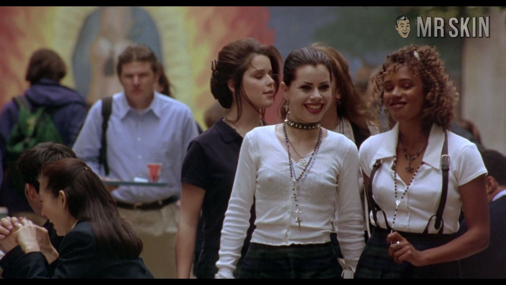 Although it offers more blood and guts than boobs and butts, we love The Craft (1996). Equal parts teen comedy, school drama and horror thriller, Andrew Fleming’s R rated flick follows a comely coven of classmates: Bonnie Harper (Neve Campbell), Nancy Downs (Fairuza Balk), and Rochelle Zimmerman (Rachel True). These “Bitches of Eastwick” don’t fit in at their parochial high school, and popular brats like Laura Lizzie (Christine Taylor) love to rub it in. But new kid Sarah Bailey (Robin Tunney) is about to join the witchy clique and give them just the kick they need to seek revenge. Sarah is well suited for the spooky group since she has a haunted history and a slew of supernatural skills. In fact, her presence empowers the magical menaces. And after summoning a sinister spirit, the fearsome foursome go on a sorcery spree that features dreams of scorpions, snakes, and spiders. Oh my! Luckily for us, the sultry school girls look alluring as they embark on their eerie coming of age journey. Along the way, they deal with Mr. Bailey (Cliff DeYoung) as well as sexy getups. In other words, Ms. True rocks a skintight bathing suit and Ms. Balk flaunts her perky pokies. No wonder they bewitched Chris Hooker (Skeet Ulrich) — and masses of fans. As a surprise hit and cult classic, the movie spawned the straight-to-DVD sequel The Craft: Legacy (also known as Blumhouse’s The Craft: Legacy) in 2020. Since then, we’ve been waiting with masturbated breath for what comes next!