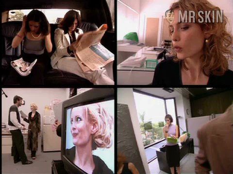 Director Mike Figgis's Time Code (2000) tells four overlapping tales, shot in continuous takes in four separate locations with four synchronized cameras, that focus on the making of a flick called Bitch of Louisiana. One story stars Saffron Burrows as the wife of producer Stellan Skarskård, a lucky duck who's having extramarital hijinks with Salma Hayek. Salma's an aspiring thespian who's also a practicing lesbian with Jeanne Tripplehorn, a jealous moneybags who plants a bug in Salma's bag. Stories interact as yarns of murder, adultery, and scummery roll out on four screens. Holly Hunter, Kyle MacLachlan, Julian Sands, Steven Weber, Leslie Mann, and cocaine also star.
